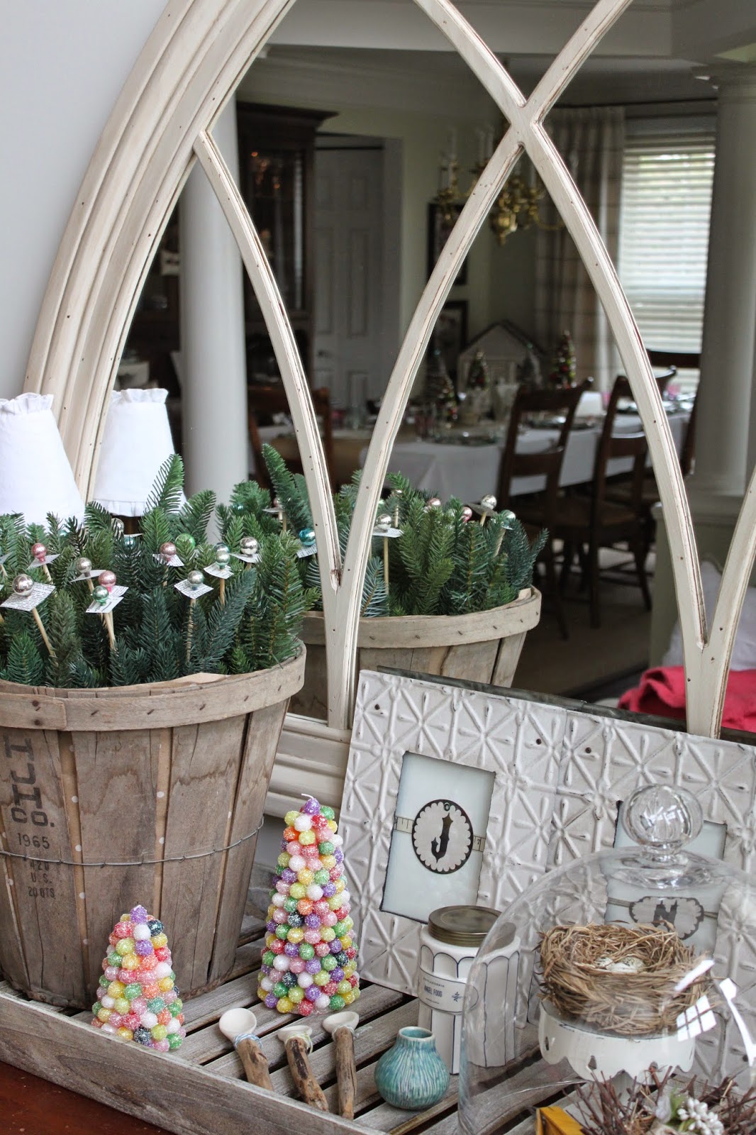 The greens and vintage ornament decorations are new this year. Tutorial coming in my next post.